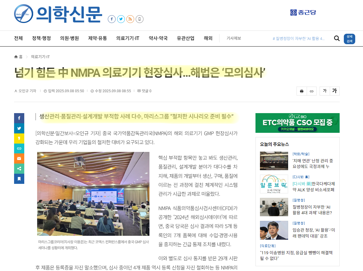 [의학신문·일간보사=오인규 기자] 중국 국가약품감독관리국(NMPA)의 해외 의료기기 GMP 현장심사가 강화되는 가운데 우리 기업들의 철저한 대비가 요구되고 있다.