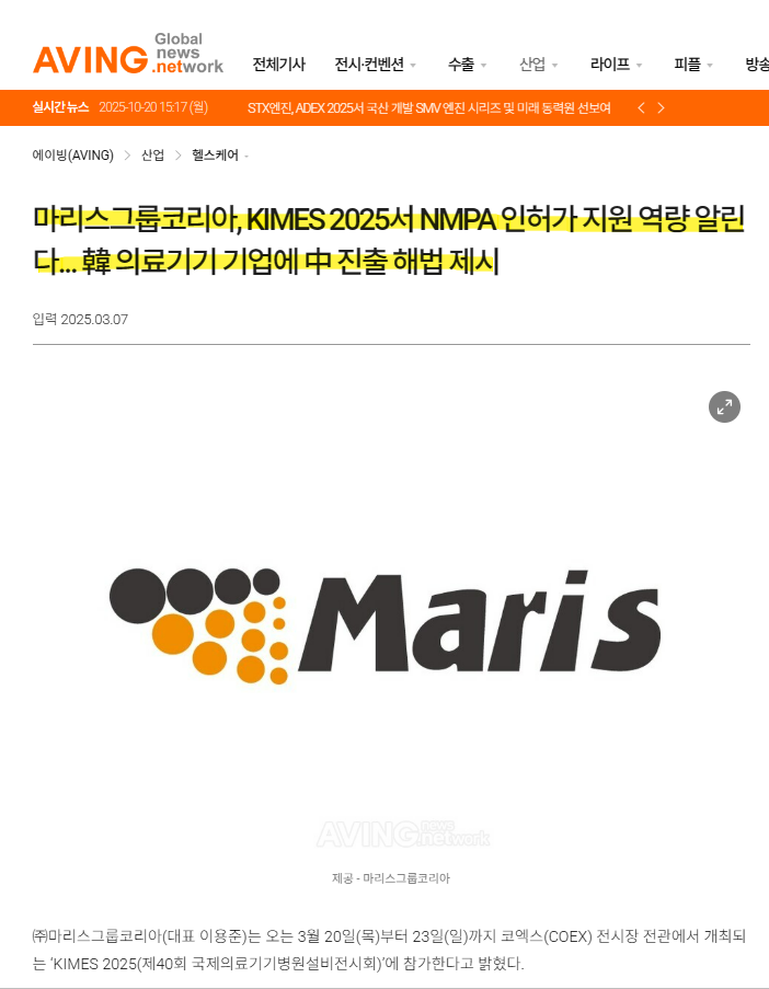 ㈜마리스그룹코리아(대표 이용준)는 오는 3월 20일(목)부터 23일(일)까지 코엑스(COEX) 전시장 전관에서 개최되는 ‘KIMES 2025(제40회 국제의료기기병원설비전시회)’에 참가한다고 밝혔다.
